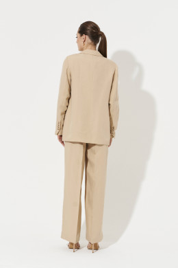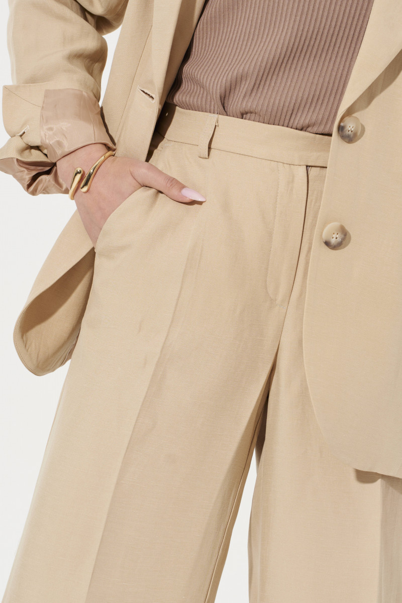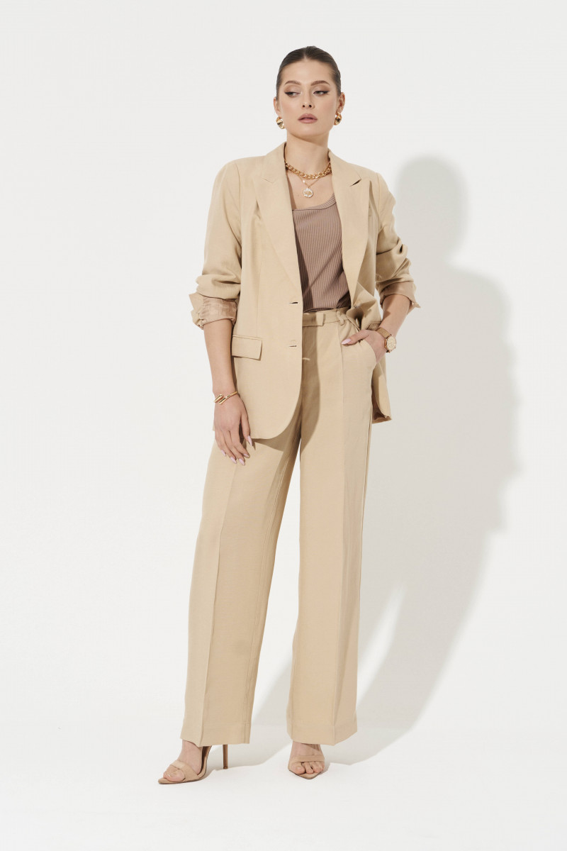 Брюки женские прямые из смесовой ткани с добавлением льна для повседневной носки. Верхний срез брюк обработан притачным поясом, застежка на один крючок, а также имеется застежка на тесьму-молнию в среднем шве брюк. Пояс брюк имеет шлевки, что дает возможность носить с ремнем. Задняя часть брюк имеет талиевые вытачки. В брюках расположен в боковом шве карман с подкройным бочком. Отличный классический вариант брюк в красивом бежевом оттенке, который станет базовой вещью в вашем гардеробе.