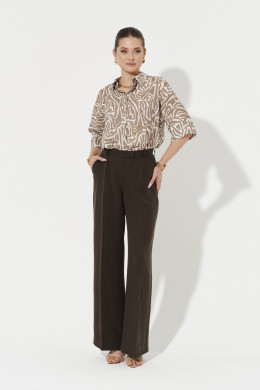 Брюки женские прямые из смесовой ткани с добавлением льна для повседневной носки. Верхний срез брюк обработан притачным поясом, застежка на один крючок, а также имеется застежка на тесьму-молнию в среднем шве брюк. Пояс брюк имеет шлевки, что дает возможность носить с ремнем. Задняя часть брюк имеет талиевые вытачки. В брюках расположен в боковом шве карман с подкройным бочком. Отличный классический вариант брюк в коричневом цвете, который станет базовой вещью в вашем гардеробе.
