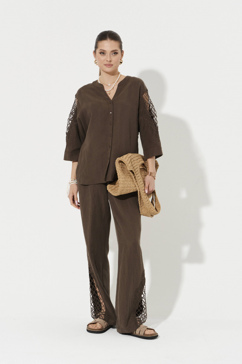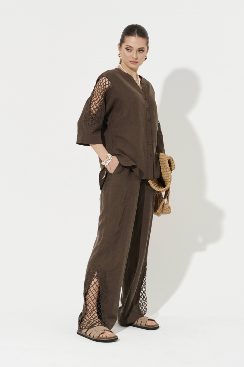 | 52 | Брюки: Высота посадки - 29см, Длина брюк без пояса - 108.5см, Длина по внутреннему шву - 84.5см, Ширина брючин сверху - 78см, Обхват брюк по низу - 64.5см, Ширина по бедрам - 60см, Ширина по талии - 42см; |