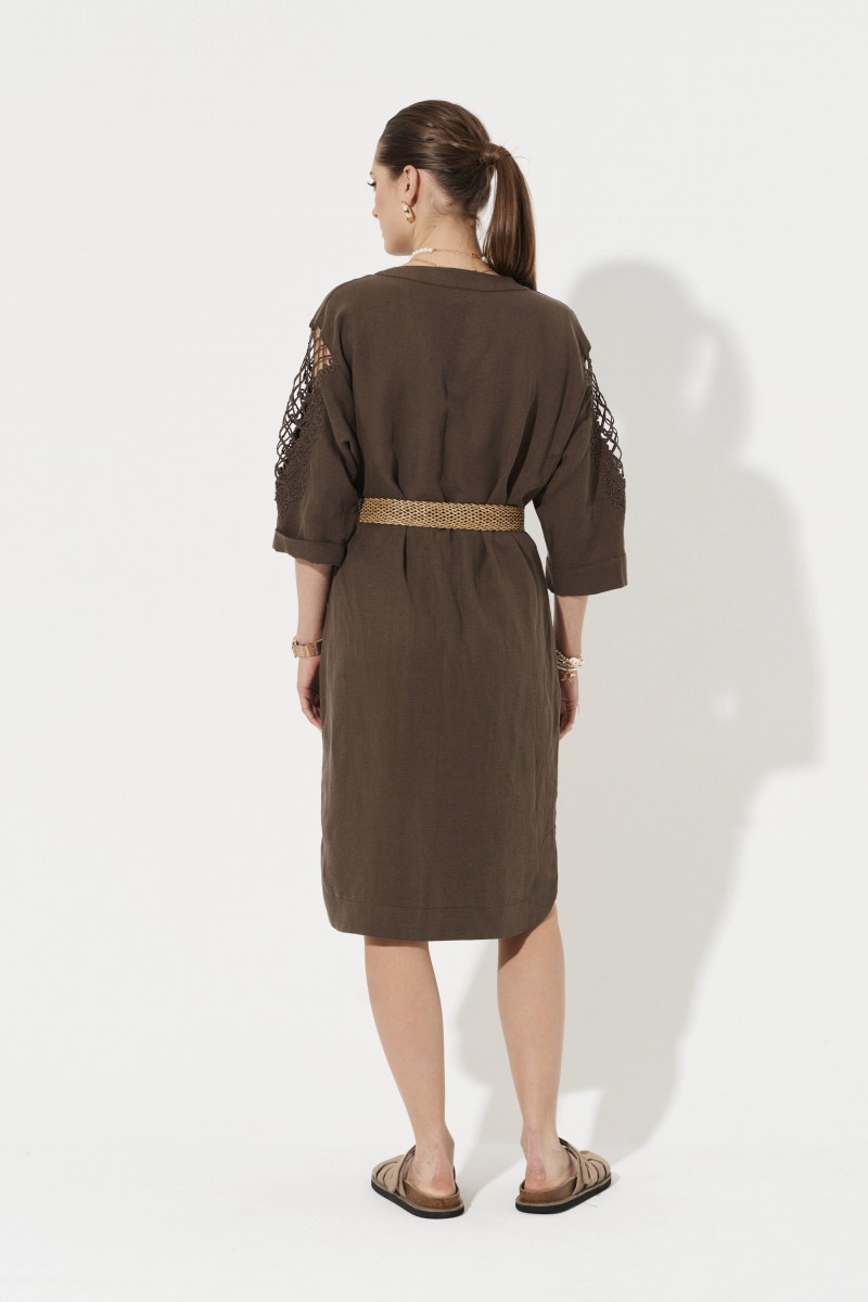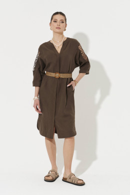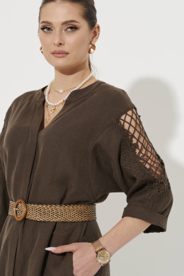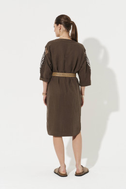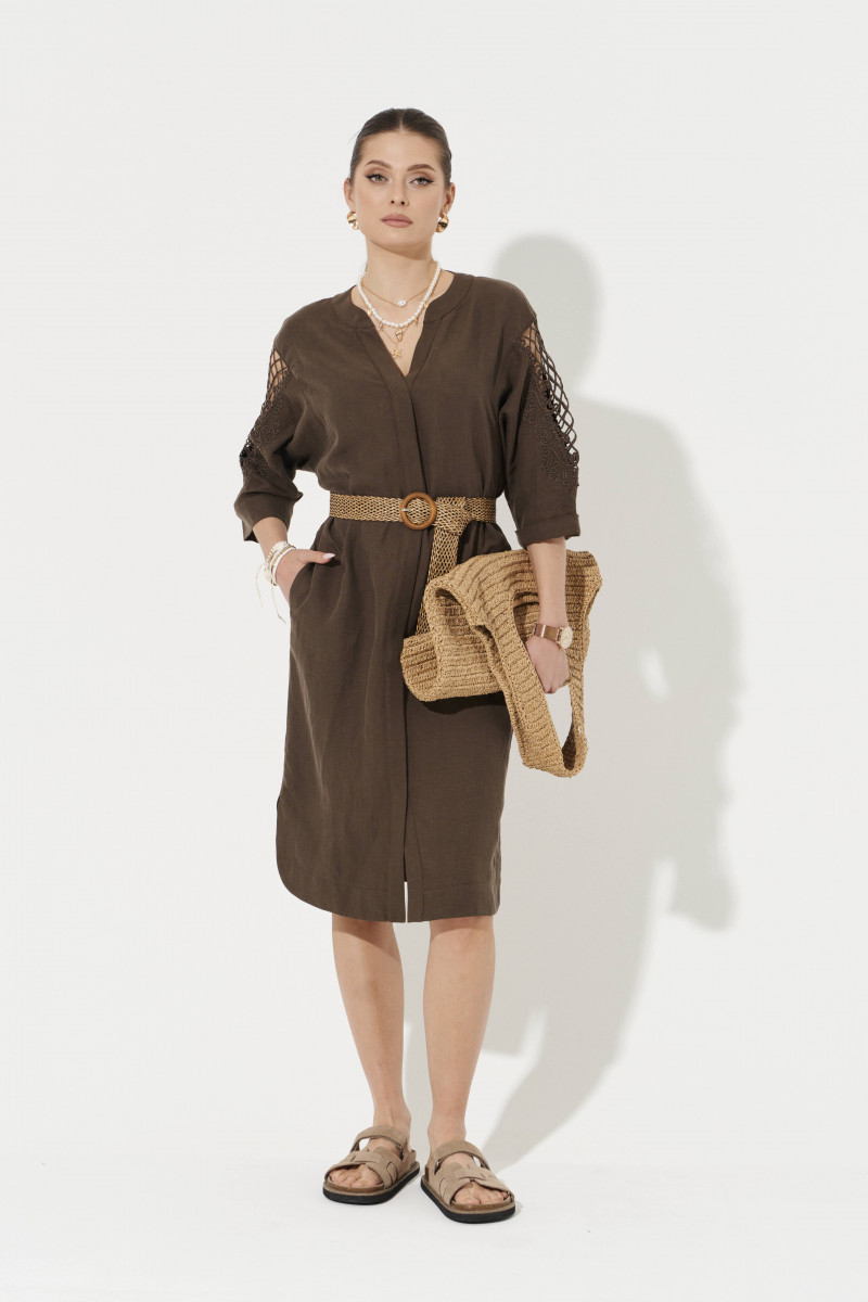 Платье женское из смесовой ткани с добавлением льна для повседневной носки. Платье прямого силуэта. Застежка супатная на обметанные петли и пуговицы. Перед и спинка слегка скруглен. В боковом шве имеются потайные карманы, а также небольшие разрезы по низу изделия. Горловина V-образная обработана отрезной стойкой и планкой. Линия плеча чуть спущена. Рукава втачные, длиной ниже локтя, на рукавах имеется дизайнерская вышивка в виде шнура. Низ рукава обработан притачной манжетой. Для дополнения образа можно использовать ремень. Соломенный ремень отлично будет подчеркивать вашу талию. Ремень можно приобрести на сайте. Платье в коричневом оттенке будет отлично сидеть и смотреться на любой фигуре, а также стильный фасон не оставит никого равнодушным. В данном платье вы всегда будете в центре внимания.