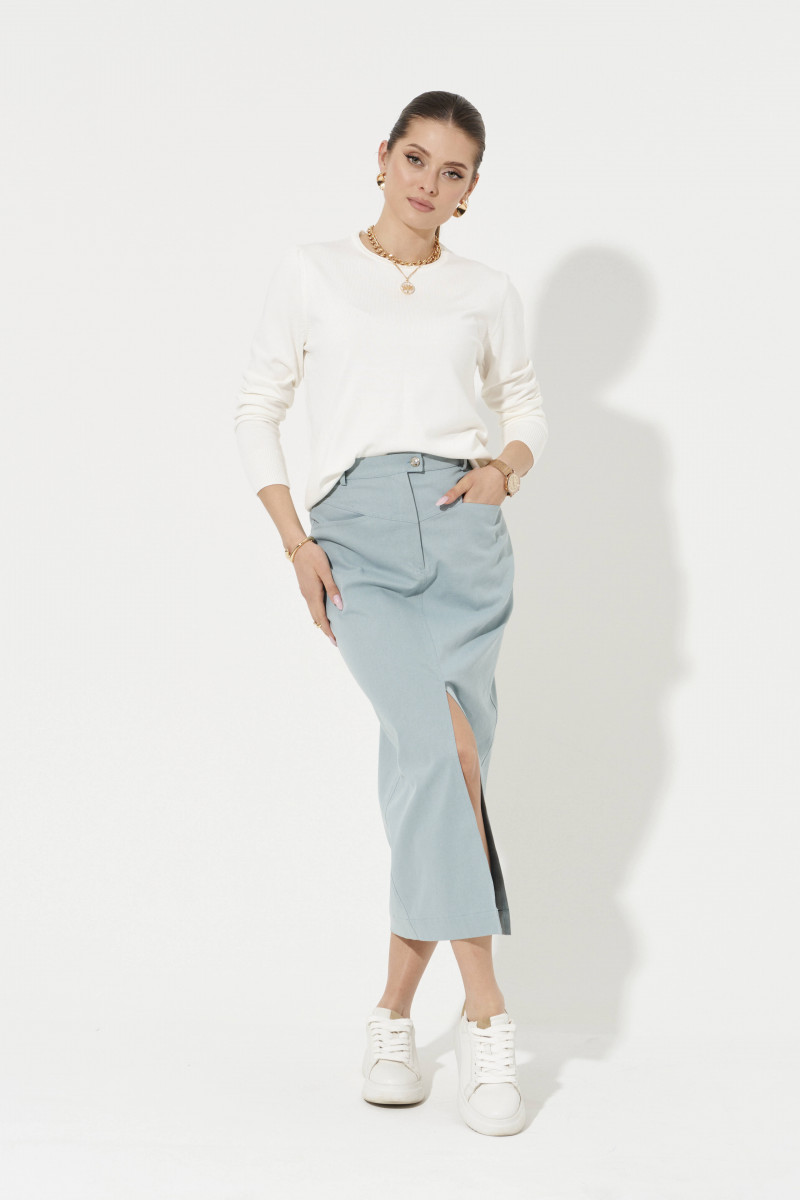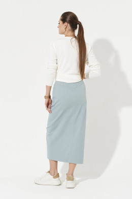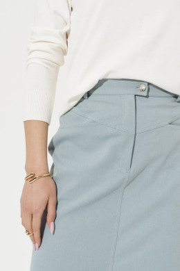Юбка женская из смесовой ткани с большим содержание хлопка для повседневной носки. Юбка прямая. Верхний срез юбки обработан притачным поясом с застежкой на одну обметанную петлю и одну пуговицу, а также имеется застежка на тесьму-молнию в среднем шве юбки. Юбка имеет шлевки, что дает возможность носить ее под пояс, тем самым вы сможете регулировать облегание в области талии. Переднее полотнище юбки имеет отрезную кокетку, а также на переднем полотнище располагаются два кармана. Переднее полотнище со средним швом и разрезом в шве. Заднее полотнище юбки имеет отрезную кокетку. Очень стильная юбка в серо-голубом оттенке , которая безусловно будет радовать вас своим чудесным видом и прекрасной посадкой.