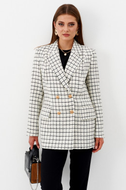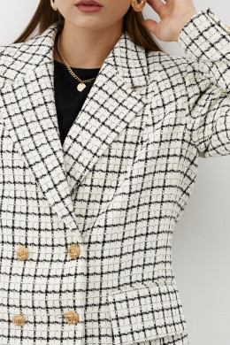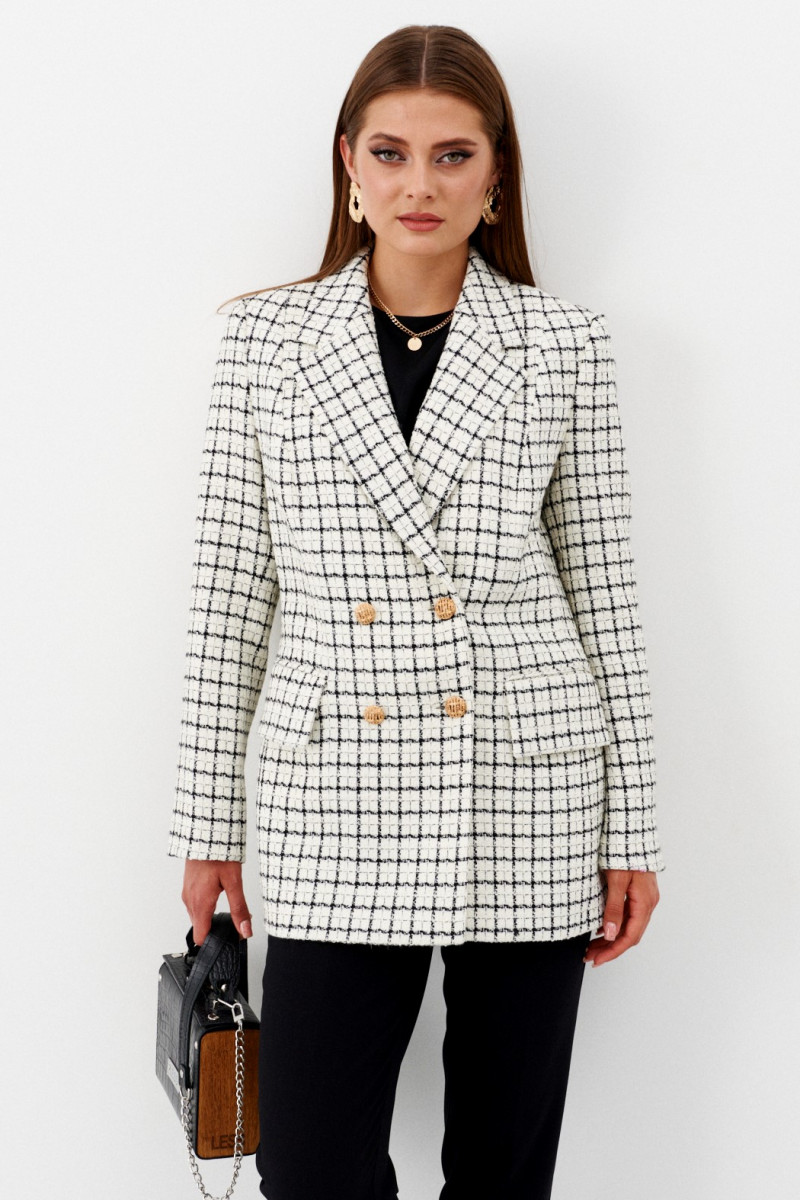 Жакет женский бренда Ketty для повседневной носки, из ткани-твид, на подкладке, полуприлегающего силуэта с втачным рукавом и английским воротником. Перед дополнен двумя прорезными карманами с клапанами. Двубортная застежка на четыре золотые пуговицы. Женский удлиненный жакет создан для стильных девушек и женщин. Длинный базовый пиджак двубортный, как жакет или кардиган, украсит повседневный образ. Модный твидовый пиджак имеет приталенный силуэт. Достаточно объемный, не обтягивающий. Клетчатый пиджак офисный больших размеров будет отлично смотреться на женщинах и девушках разной комплекции. Простой и красивый пиджак на пуговицах сделает вас визуально стройнее и выше. Такая одежда подходит для делового и офисного стиля, вечернего образа, на свидание, на прогулку. Благодаря своему составу, классический пиджак плотный, не мнется.