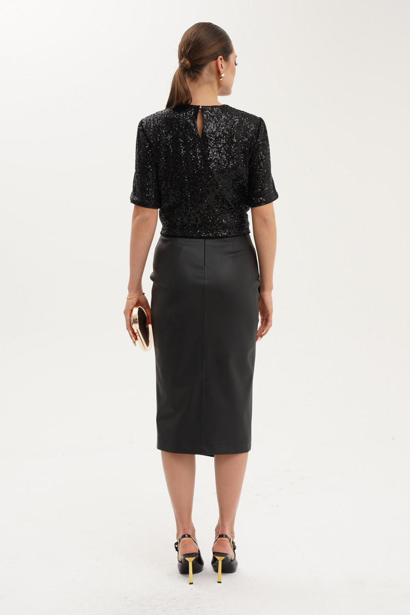 Юбка женская из эко кожи для повседневной носки. Верхний срез юбки обработан обтачкой. Облегающая юбка карандаш имеет на переднем полотнище разрез сбоку по ноге. В юбке имеется потайная застежка-молния в среднем шве заднего полотнища юбки. Юбка на поливискозной подкладке. Длинна юбки миди. Очень красивая юбка, в которой вы будете чувствовать себя комфортно.