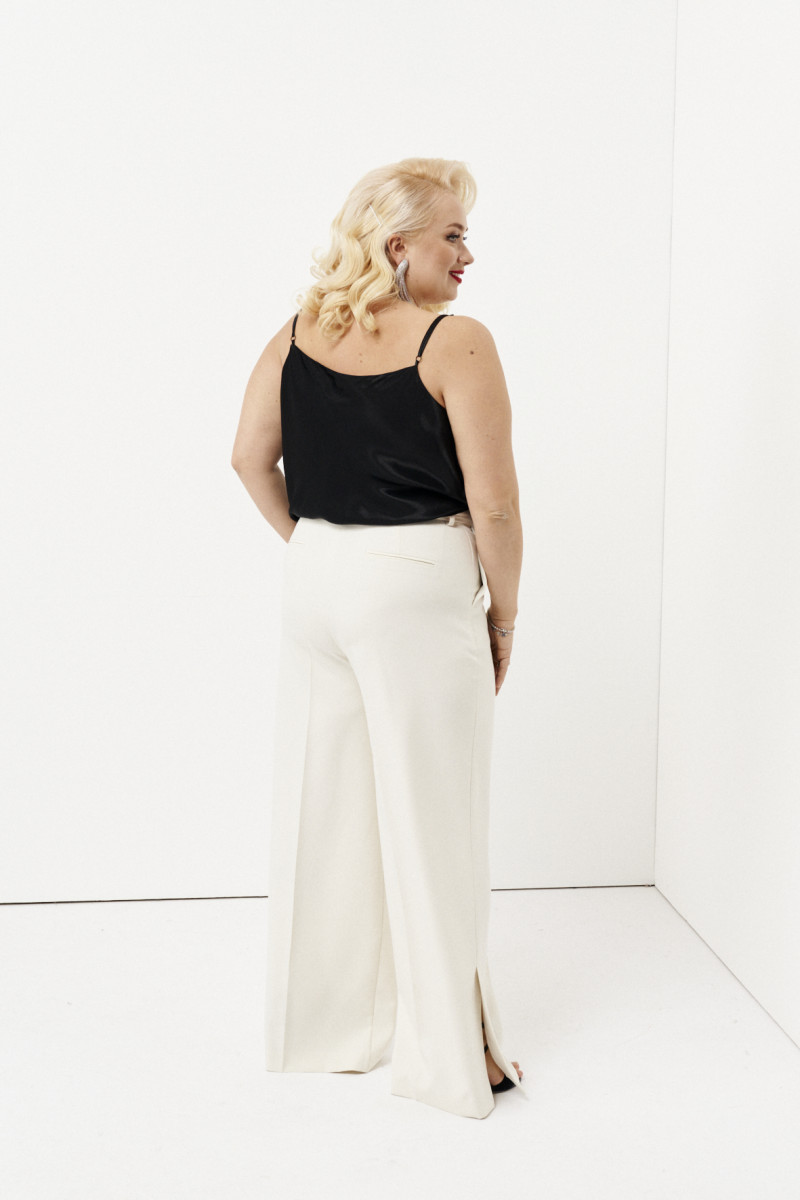 | 44 | Брюки: Высота посадки - 28см, Длина брюк без пояса - 109см, Длина по внутреннему шву - 84.5см, Ширина брючин сверху - 66.5см, Обхват брюк по низу - 54.5см, Ширина по бедрам - 48см, Ширина по талии - 35см; |