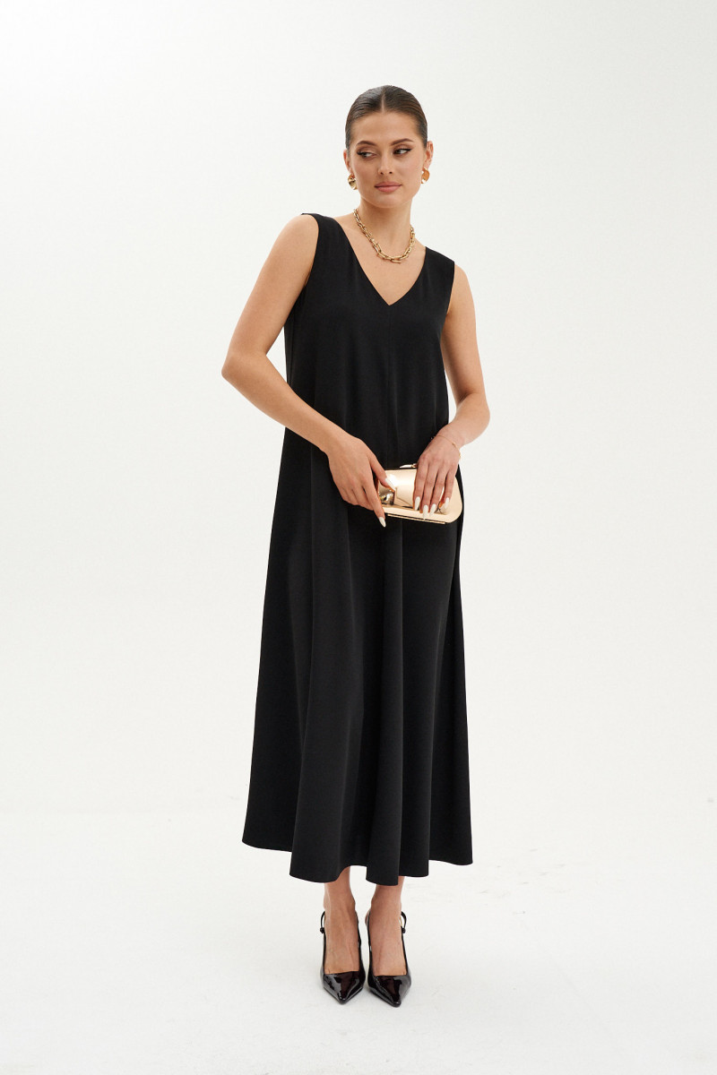 Платье из струящейся ткани для повседневной и торжественной носки. Платье, чуть расширенное к низу. Перед и спинка со средним швом. Горловина по переду и по спинке V-образная, обработана обтачкой. Платье без рукавов. Длина изделия макси. Красивое и стильное платье, которое будет отлично смотреться на любой фигуре.
