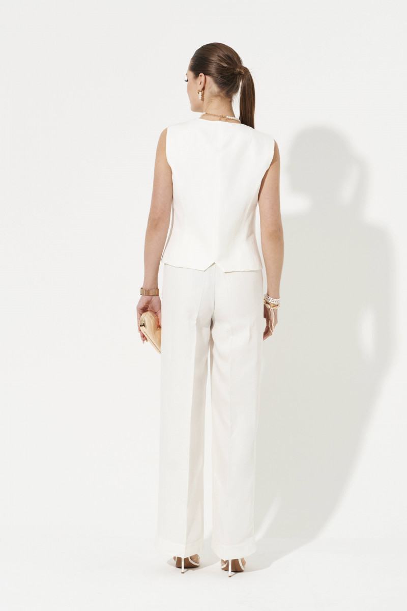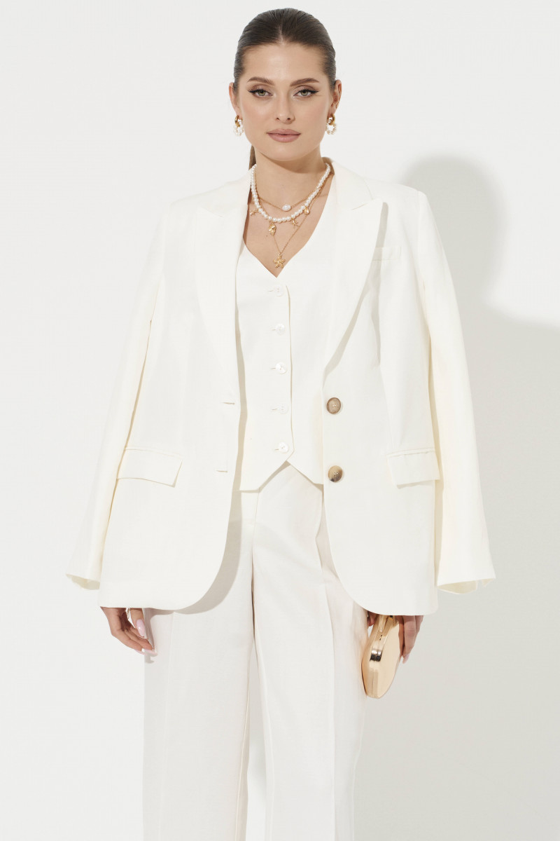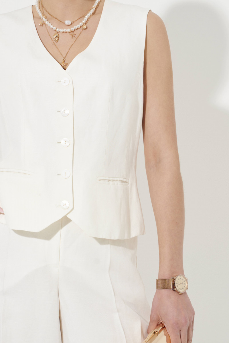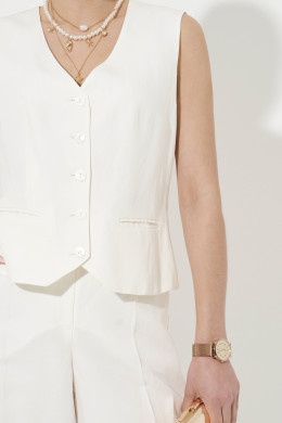 Жилет женский для повседневной носки в классическом стиле бренда Ketty - современная база женского гардероба. Жилет полуприлегающего силуэта. Классический жилет выполнен из льняной ткани. Перед имеет два прорезных кармана в рамку с двумя обтачками, а также две талиевые вытачки. Горловина с V-образным вырезом. Жилетка короткая с центральной бортовой застежкой на обметанные петли и пуговицы. Жилет на вискозной подкладке. Жилетка в нежном молочном оттенке станет не заменимой вещью в вашем гардеробе, она отлично будет подчёркивать все ваше изящество.