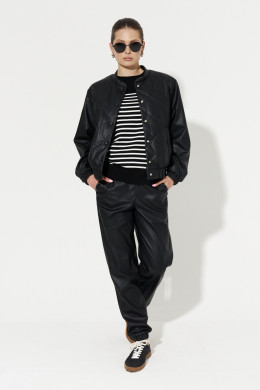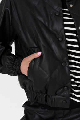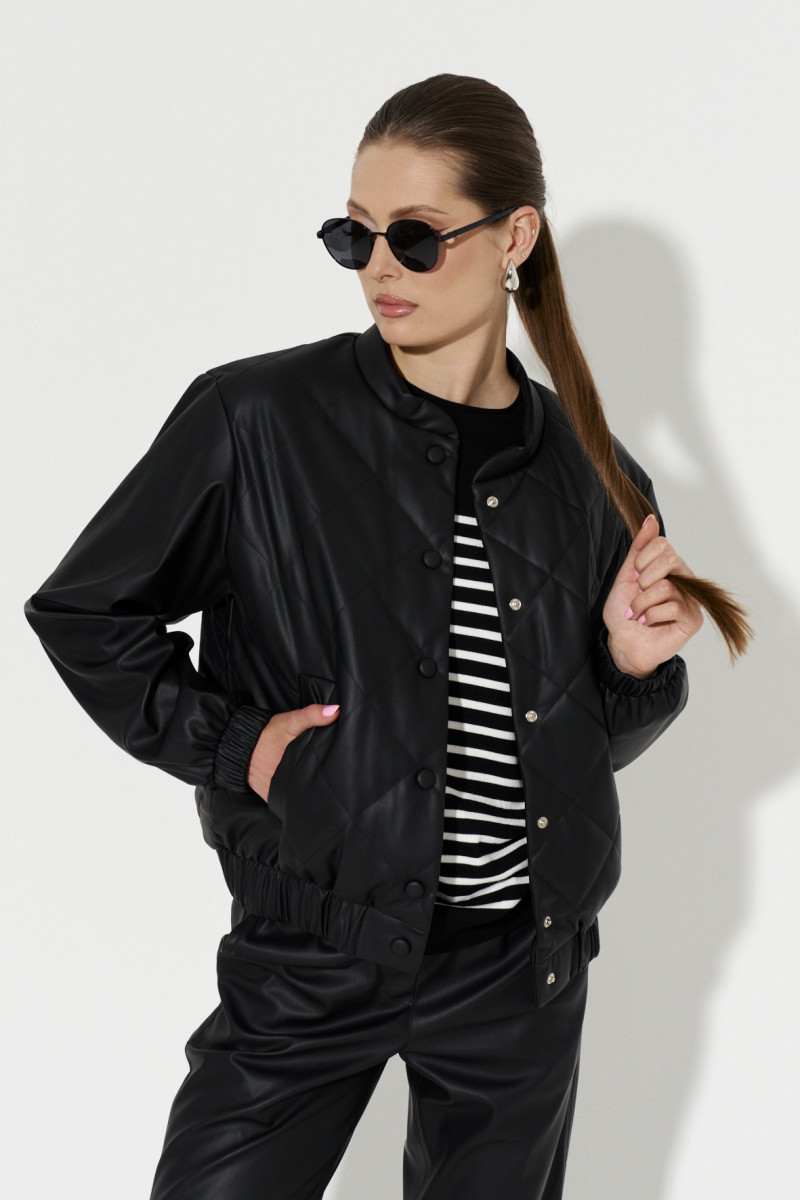 Жакет женский из смесовой ткани, эко кожи для повседневной носки прямого силуэта на подкладке. Подкладка из смесовой ткани. Перед имеет прорезной карман с листочкой. В жакете имеется центральная бортовая застежка на кнопки. Горловина обработана воротником стойкой. Низ изделия имеет притачной пояс на резинке. Рукава втачные длинные, низ рукава обработан притачной манжетой на резинке. Очень стильный и комфортный жакет, в котором вы всегда будете в центре внимания.