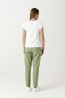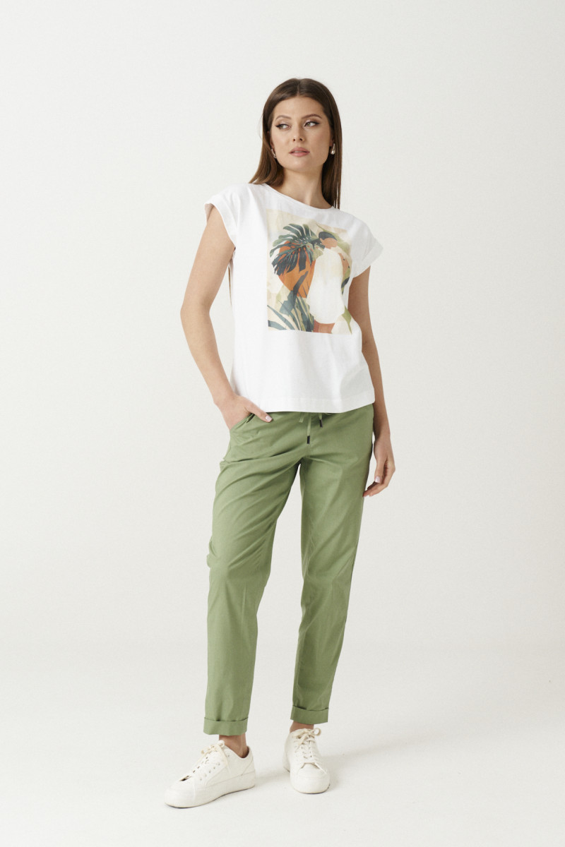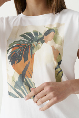Джемпер женский из трикотажного полотна (хлопок) для повседневной носки. Горловина круглая, линия плеча слегка спущена пройма оформлена манжетой. Джемпер прилегающий, длиной до середины бедра. На передней части изделия дизайнерский принт.