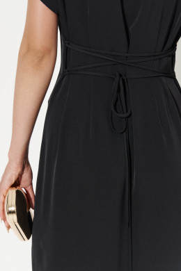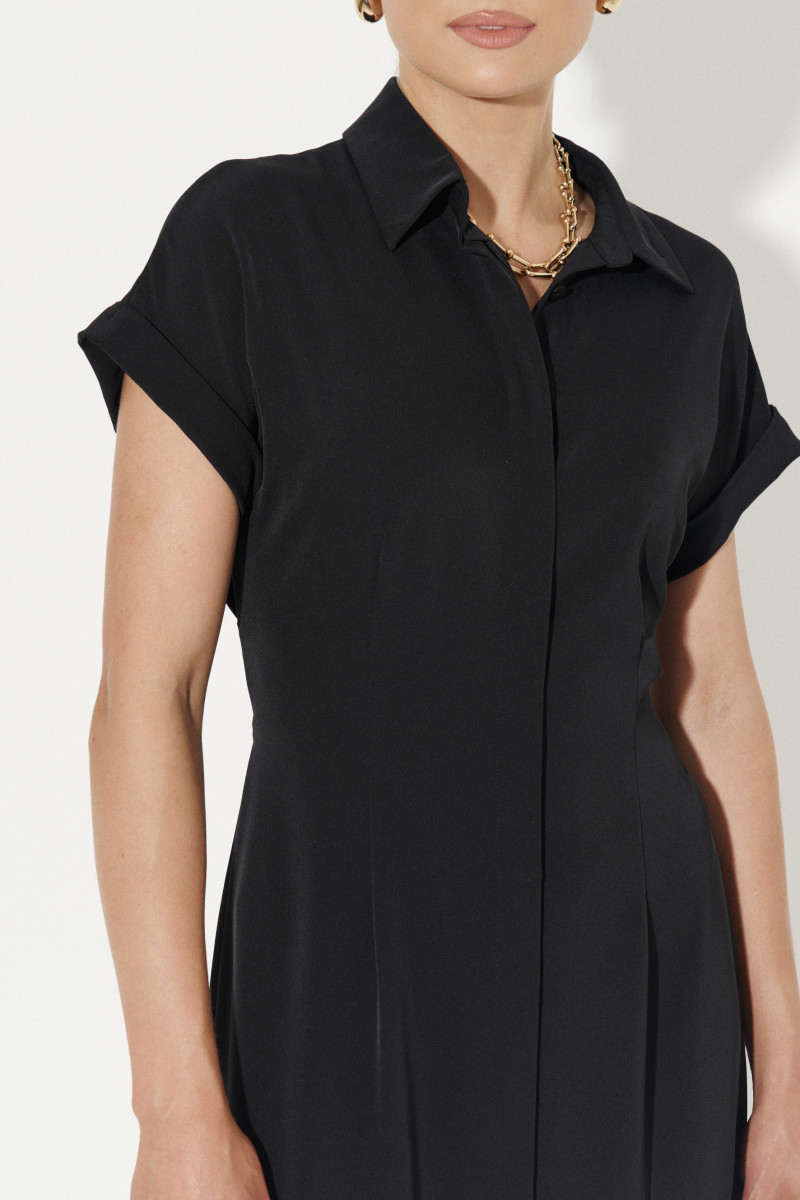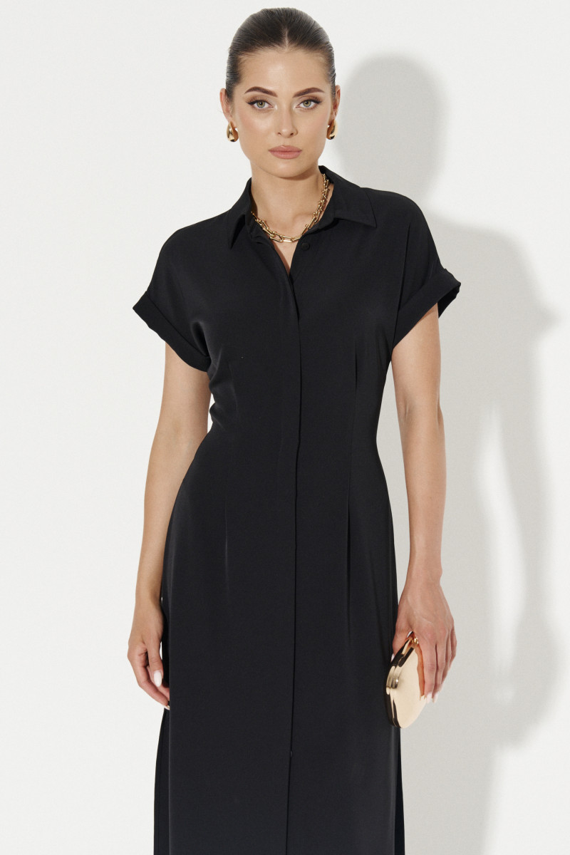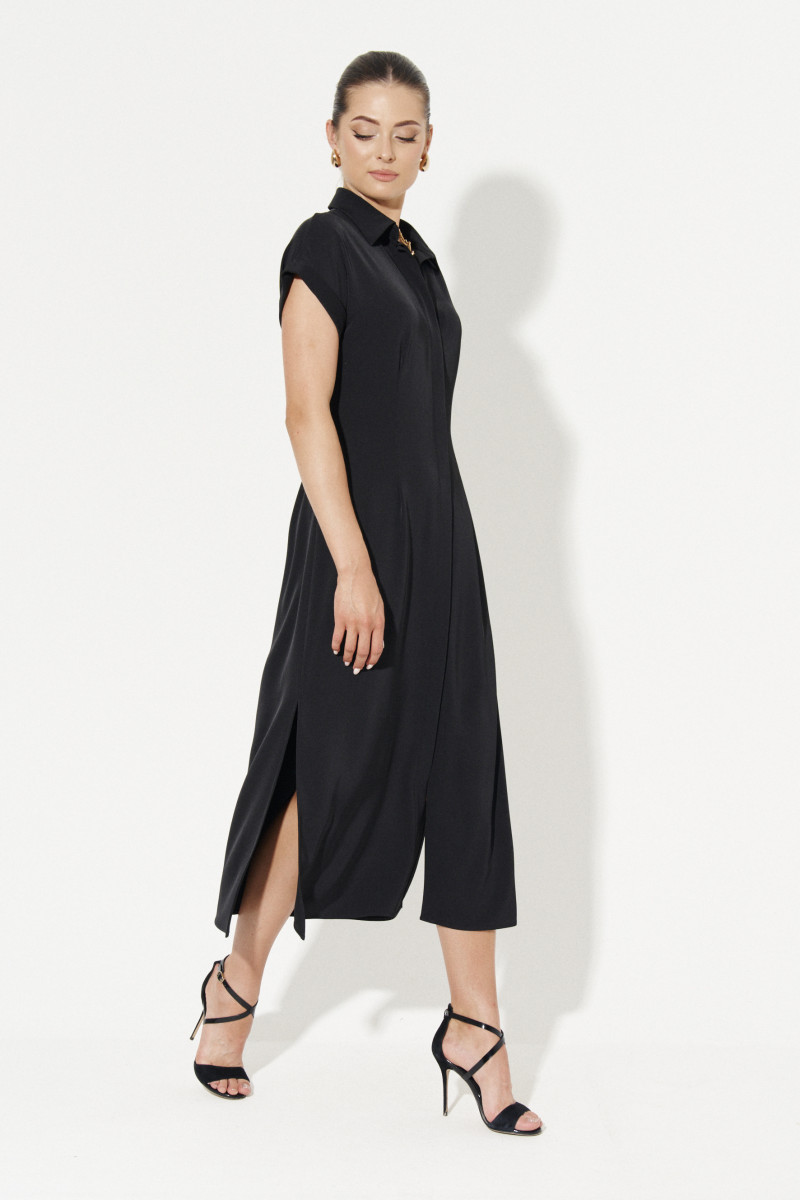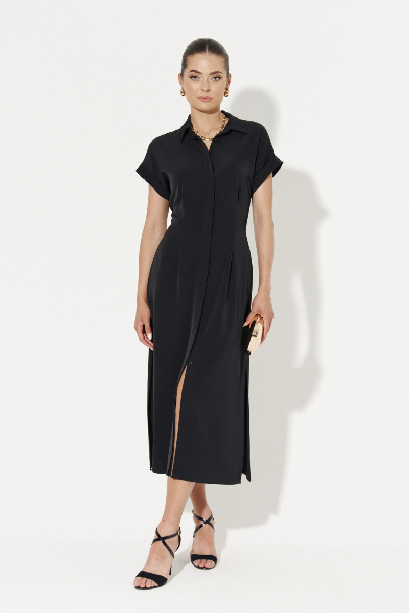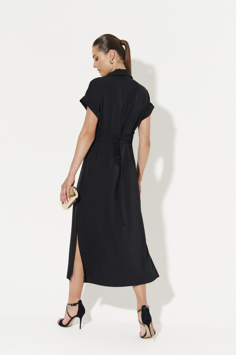 Платье женское из лёгкой струящейся ткани для повседневной носки полуприлегающего силуэта. Перед с талиевыми вытачками. В платье имеется центральная бортовая супатная застежка на обметанные петли и пуговицы. В боковом шве имеются разрезы до низа изделия, а также в области талии располагаются петли, через которые протянута завязка для регулировки талии. Спинка с талиевыми вытачками. Горловина обработана рубашечным воротником на стойке. Рукав цельнокроеный, короткий. Линия плеча слегка спущена. Красивое и очень удобное платье, которое станет вашим фаворитом.