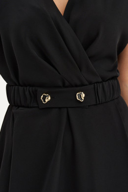 Платье женское из струящейся ткани полуприлегающего силуэта. Платье отрезное по линии талии. Верхняя часть платья на запах со складками. Платье, расширенное к низу. Переднее полотнище имеет два защипа. Спинка имеет талиевые вытачки и средний шов, имеется застежка-молния в шве. Заднее полотнище юбки имеет две талиевые вытачки. В боковом шве платья имеются прорезные карманы. Горловина V-образная. Рукава цельнокроеные, короткие. Платье на вискозной подкладке. Для придания еще большего облегания в области талии имеется пояс на резинке. Очень стильное и изящное платье, которое отлично будет подчеркивать вашу фигуру. Подойдёт для торжественных случаев. Платье очень удобное и практичное в носке.