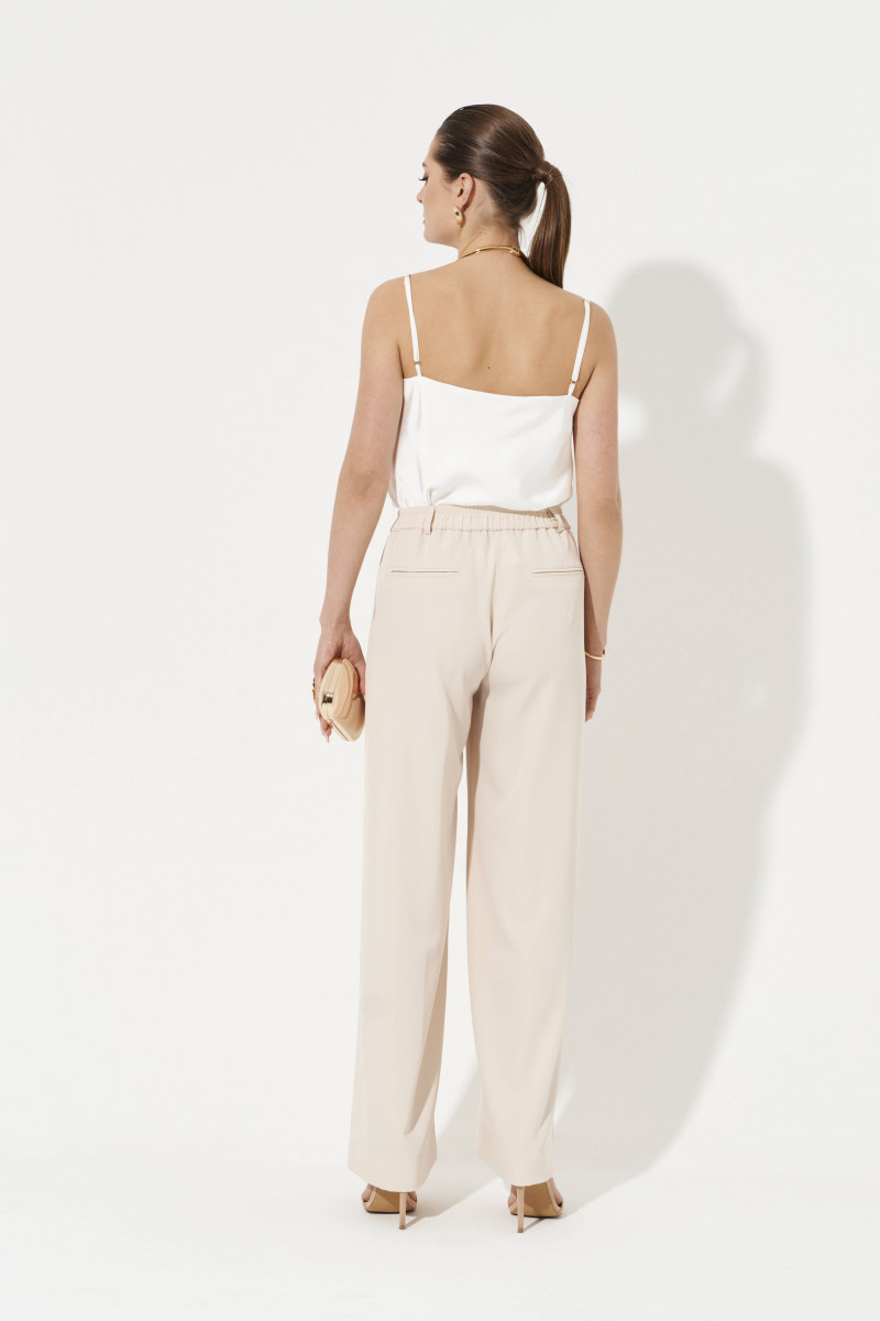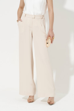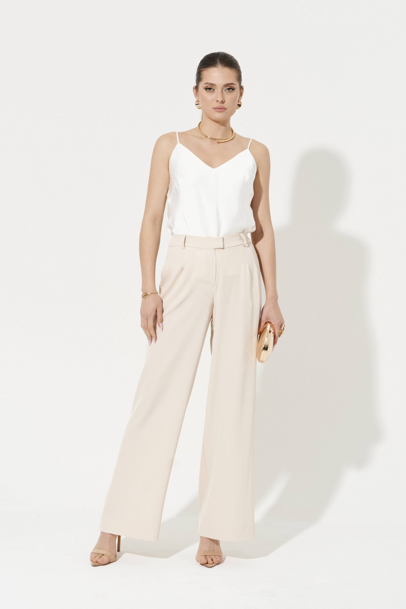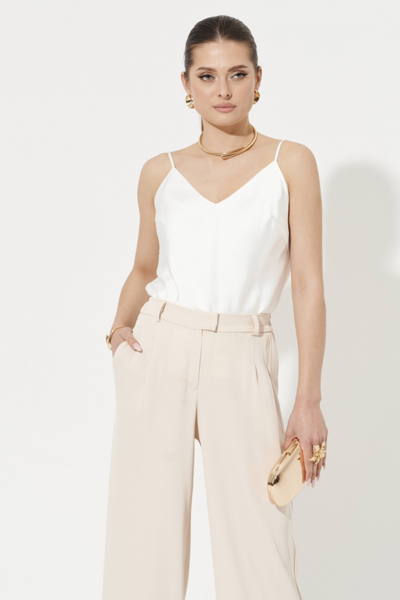 Брюки женские прямые из лёгкой струящейся ткани. Верхний срез брюк обработан притачным поясом с вставкой на резинке по задней части брюк, застежка на одну обметанную петлю и одну пуговицу, а также имеется застежка на тесьму-молнию в среднем шве брюк. Передняя часть брюк имеет четыре талиевых вытачки. Задняя часть брюк имеет две талиевые вытачки и прорезной карман в рамку. В брюках расположен в боковом шве прорезной карман. Брюки подойдут для повседневной носки либо для торжественных случаев. Отличный классический вариант брюк, которые будут гармонично смотреться под любые изделия.